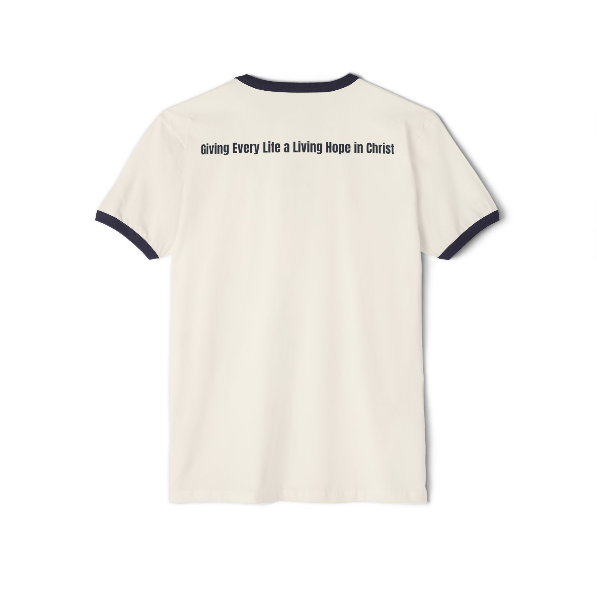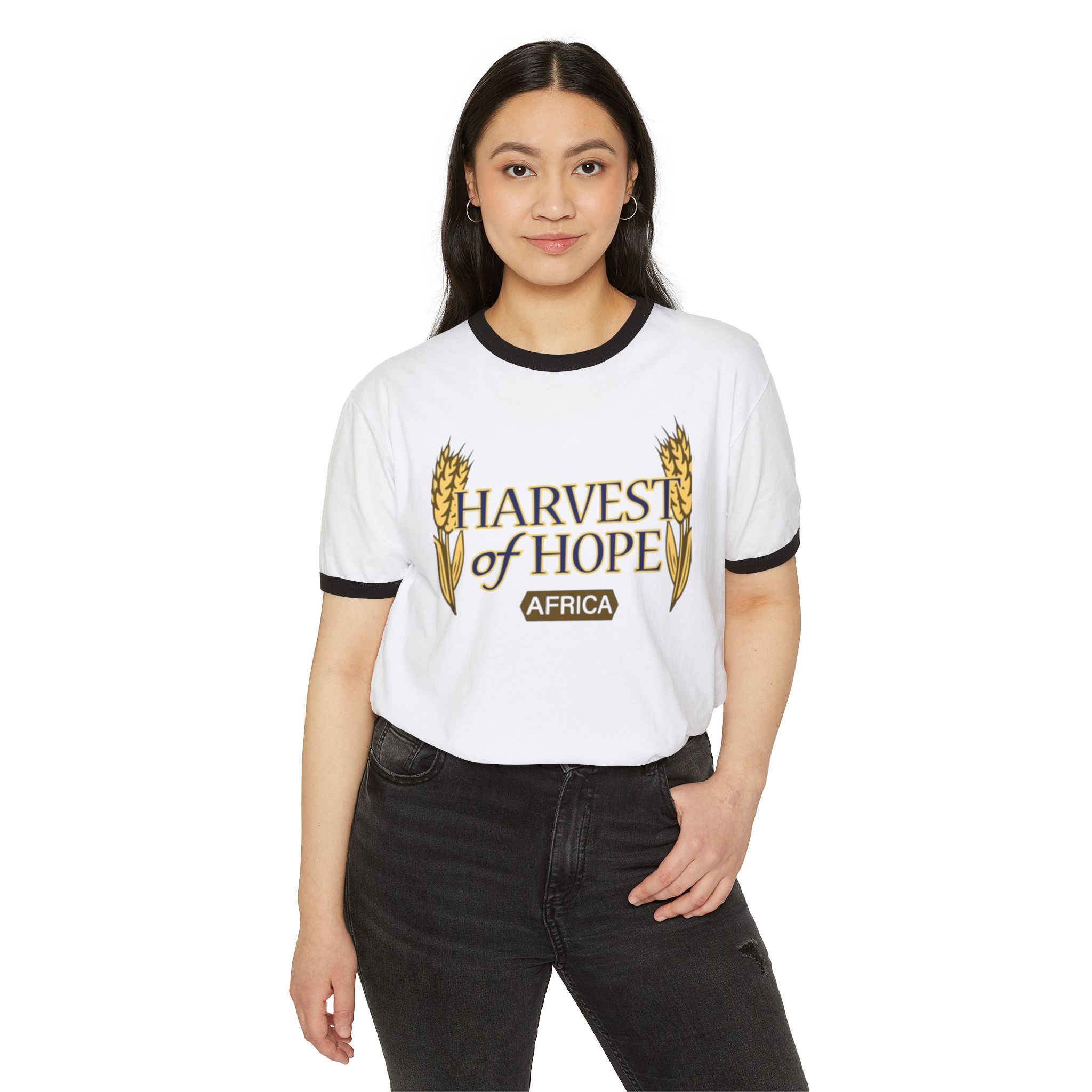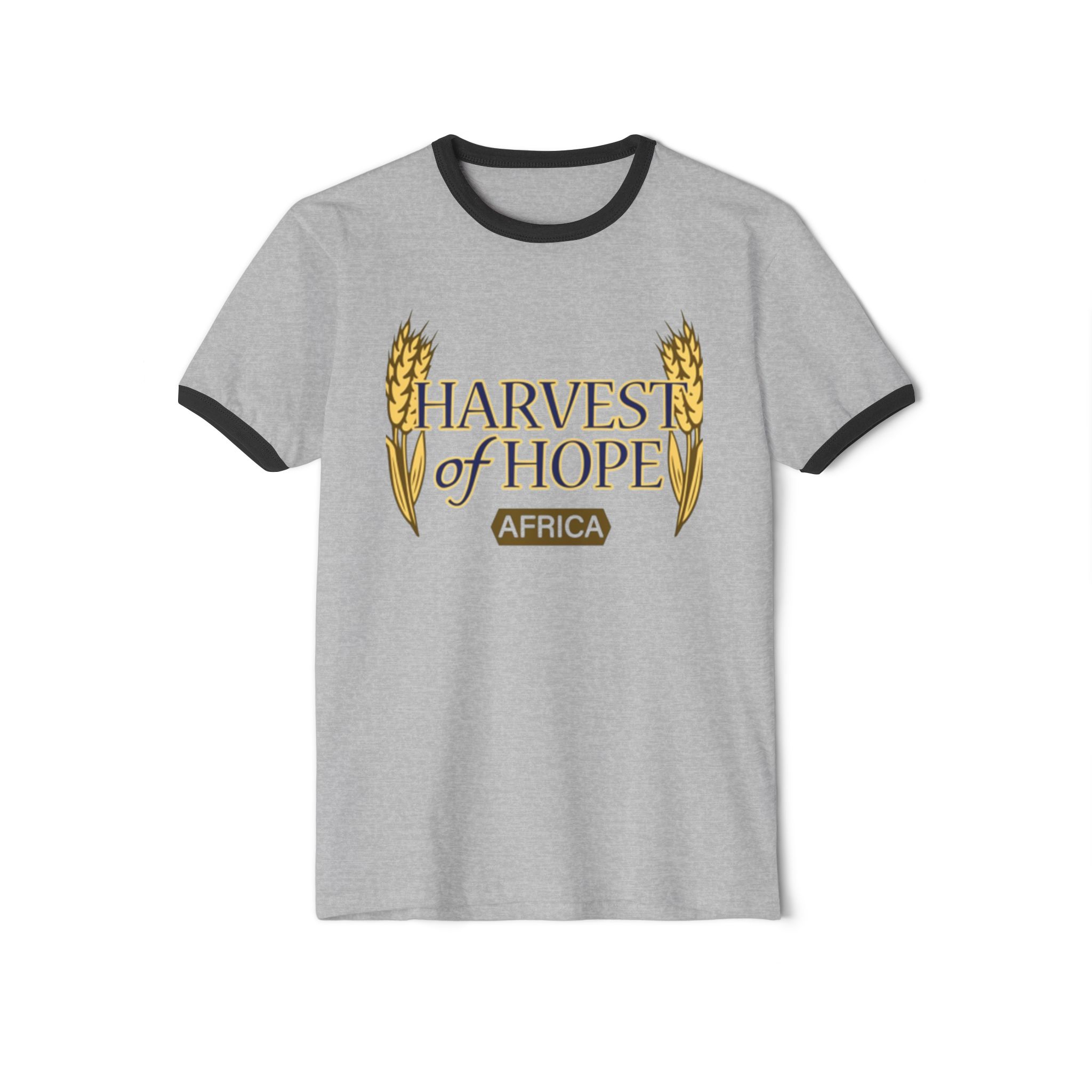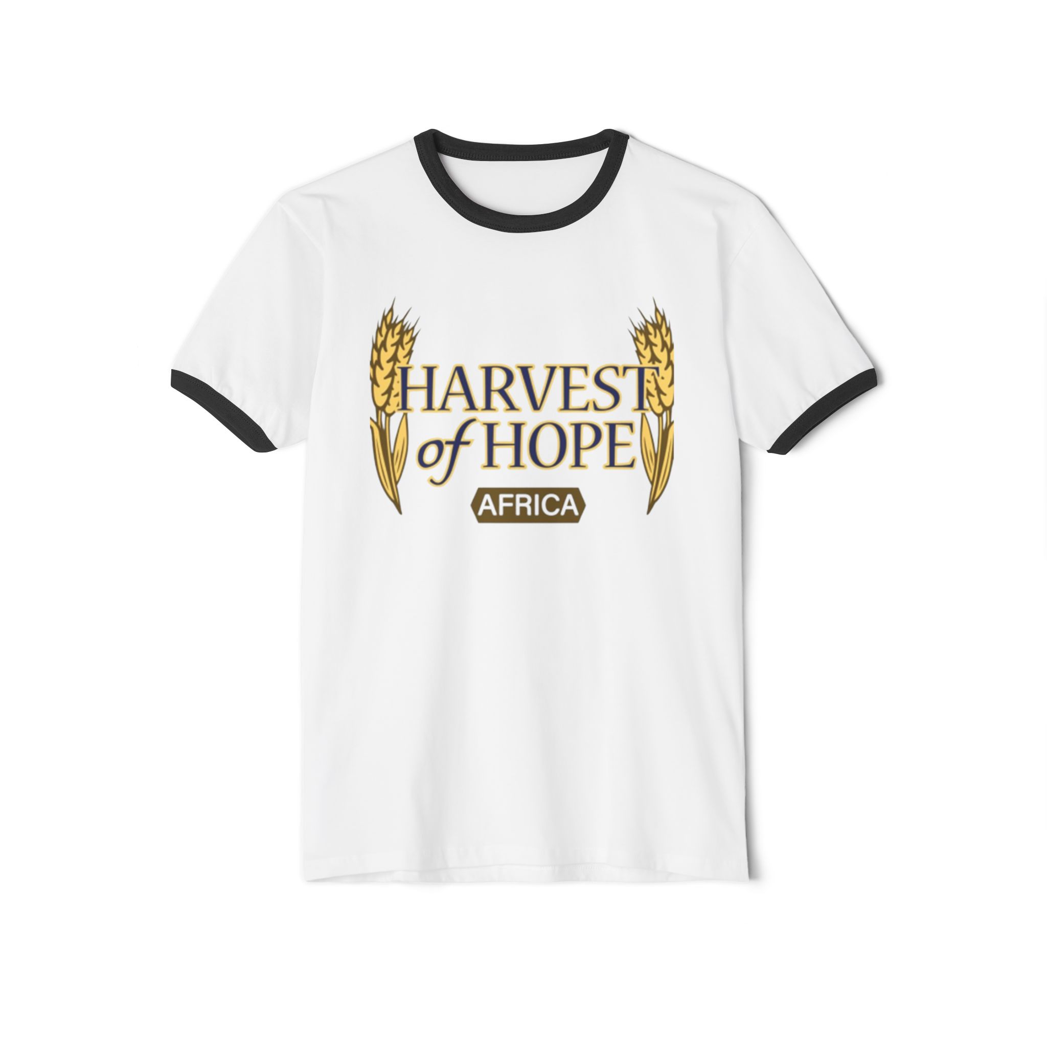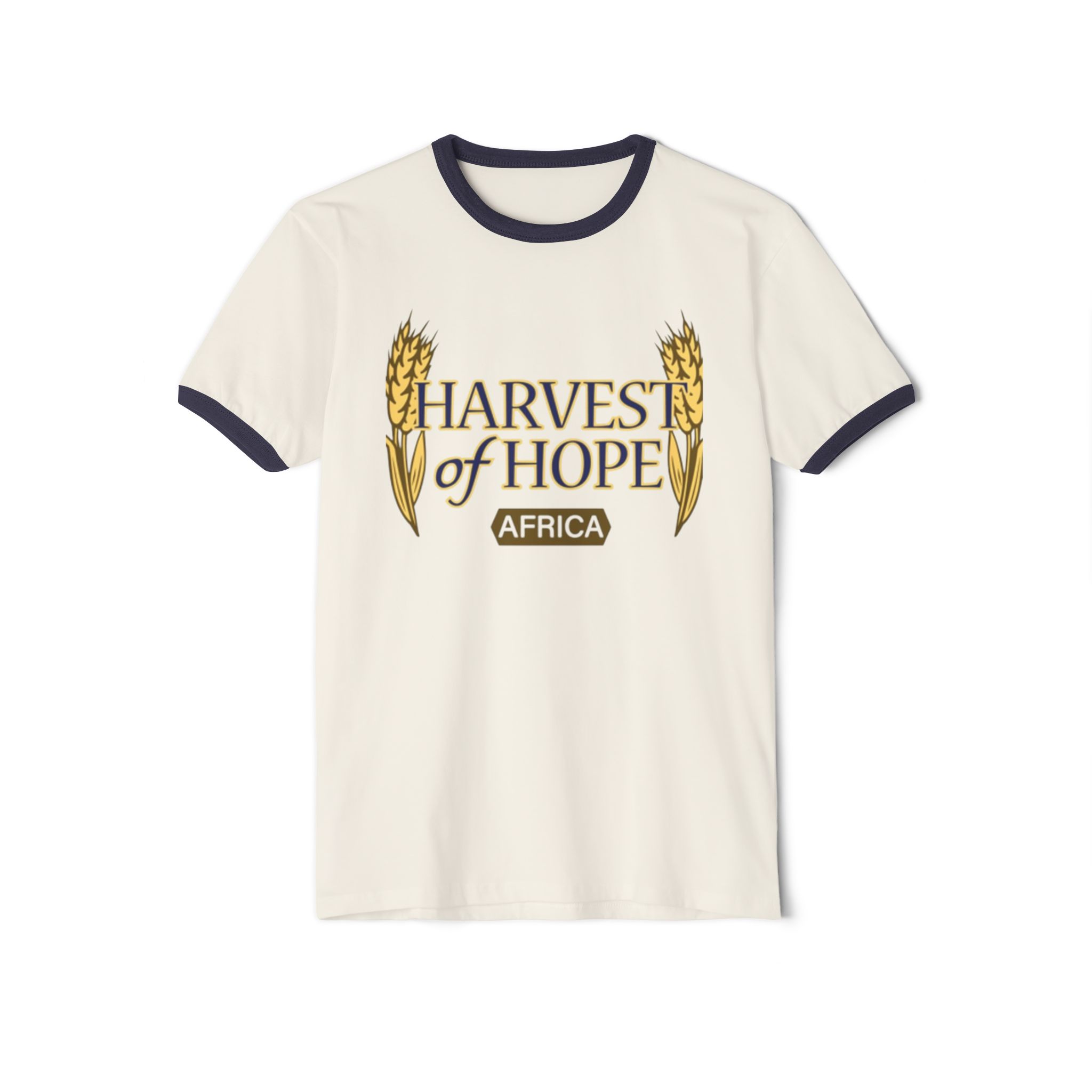 A soft, vintage-inspired ringer tee that carries a quiet, hopeful message. Creamy off-white fabric with deep navy trim frames a warm, wheat-themed graphic reading “Harvest of Hope” across the chest and a subtle line of text across the upper back. Light and breathable, it drapes easily over jeans or layered under a jacket. Wear it to share a gentle statement of faith and service, whether at community events, mission gatherings, or relaxed weekends when you want your clothing to speak with calm conviction.